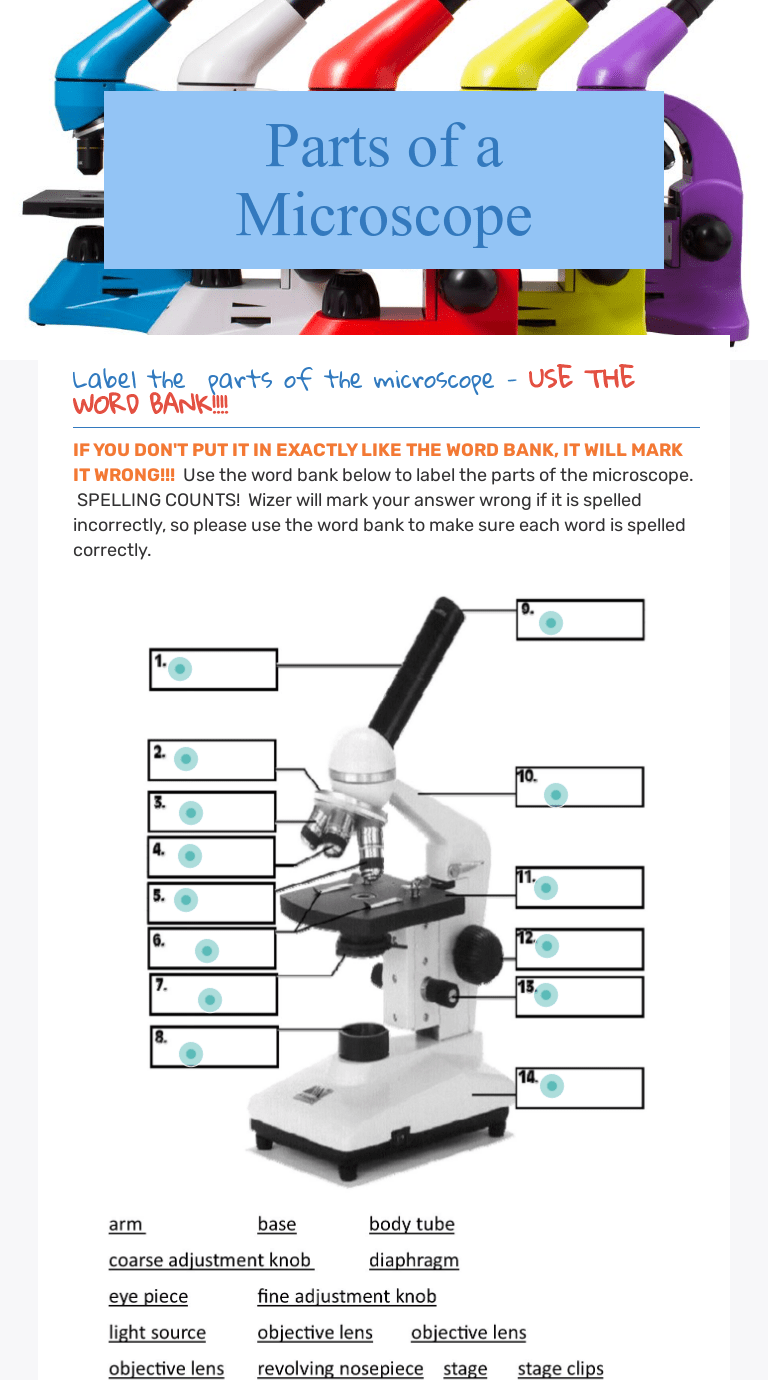 In this worksheet, students will look at the different parts of a light microscope and be able to label one correctly. This is the eyepiece lens that usually magnifies by a power of 10. This worksheet can be used for practice, review, assessment, homework, and test preparation. Can be rotated to change magnification. Teach them the parts of a light microscope in an engaging .